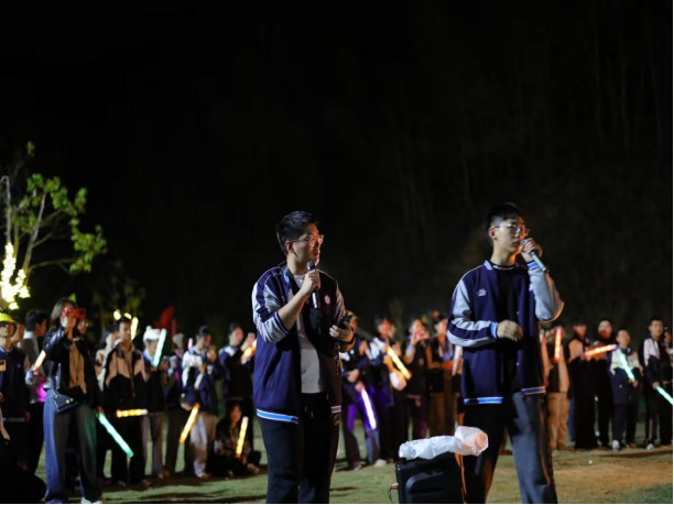 茶舟饭息之后,天色渐暗,可同学们的热情却丝毫未减。随着一点星星之火在广场中央燃起,整个篝火晚会的气氛也瞬间到达了高潮。同学们挥舞着手中的荧光棒,在炫影和火光间,尽情洋溢着青春的气息。在此期间,本班朱宋喆和许志昊两位同学还同台表演,激情演唱歌曲《我不配》,为同学们的研学之旅留下最美好的回忆。