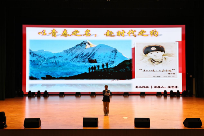 最后,高二74班安艺清以戍边英雄陈祥榕收尾宣讲,讲述其以“清澈的爱,只为中国”守护国土、壮烈牺牲的事迹,衔接革命英烈精神,完成“缅怀—传承—践行”的逻辑闭环。