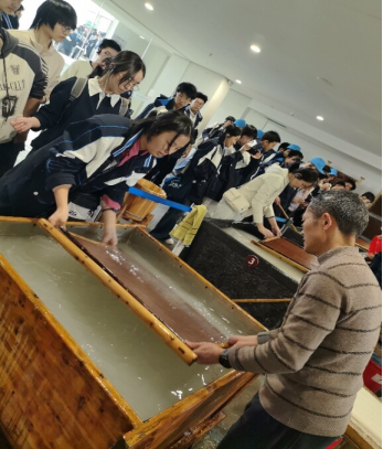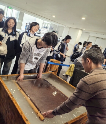 同学们沿着古法宣纸的制作流程依次参观,了解到宣纸以皖南特有的青檀皮和沙田稻草为主要原料,历经浸泡、蒸煮、漂白、打浆、捞纸、晒纸、剪纸等一百零八道工序,前后耗时近三年才能最终成纸。在古法捞纸作坊,老师傅们手持特制竹帘,手臂轻扬、手腕稳落,一抬一放间,纸浆均匀附着,薄如蝉翼的纸胎瞬间成型,动作行云流水,尽显千年传承的精湛技艺。大家近距离观察晒纸艺人在火墙上细心熨烫、修整纸张,感受匠人对每一道工序的极致苛求。在体验环节,同学们纷纷上手尝试捞纸,才明白看似简单的动作背后,需要多年练习才能掌握力度与平衡,真正体会到“纸寿千年,墨韵万变”的背后,是一代代匠人“择一事、终一生”的坚守与执着。指尖触碰温润的宣纸,大家仿佛触摸到中华文脉绵延不绝的温度,文化自信在心中悄然扎根。