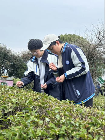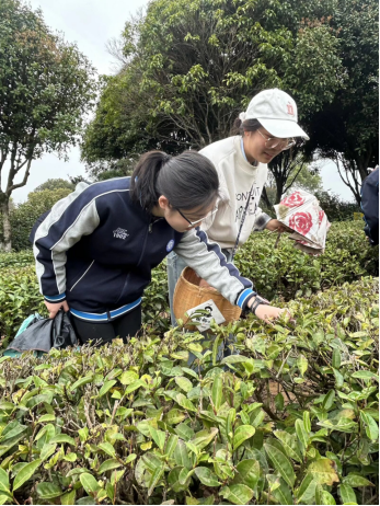 告别老街,师生们来到绿意绵延的谢裕大茶博园,置身于层层叠叠的茶园之中。远山如黛,近茶含露,满目青翠扑面而来,清新的茶香混着泥土的气息沁人心脾。在茶农与讲解员的指导下,同学们化身小小茶农,身挎竹篮,指尖轻捻,小心翼翼地采摘着最鲜嫩的茶芽。大家认真学习“一芽一叶”的采摘标准,感受着茶叶在指尖的柔韧,在弯腰与抬手间,体会着茶农劳作的辛劳与诗意。