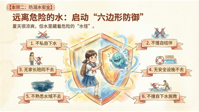 在谈到防溺水安全时,郑老师针对夏季溺水事故易发期,他反复强调“六不”原则:不私自下水游泳,不擅自与他人结伴游泳,不在无家长或教师带领的情况下游泳,不到无安全设施、无救援人员的水域游泳,不到不熟悉的水域游泳,不熟悉水性的学生不擅自下水施救。郑老师还告诉同学们,如果真的遇到溺水,首先要保持冷静,大声呼救,尽量仰面漂浮,让口鼻露出水面,寻找可以抓住的漂浮物。如果发现他人溺水,绝不能盲目下水施救,应立即呼救,拨打110和120,同时寻找竹竿、绳子、救生圈等物品抛给溺水者。这些知识,可能平时用不到,但关键时刻却能救人一命。