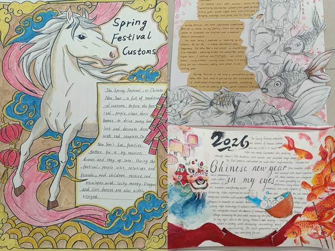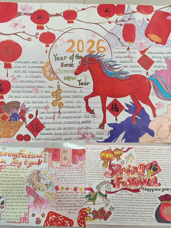 一幅幅精美的手抄报或浓墨重彩,展现节日的热闹场面;或清新雅致,讲述动人的年俗故事。有的作品将“马”的形象刻画得栩栩如生,有的则用工整的书法抄写了关于春节的英文介绍,更有同学别出心裁,在手抄报上贴了立体剪纸,让平面作品变得生动有趣。每一份作品都凝聚了同学们的智慧与心血,不仅展现了他们扎实的英语书写功底和绘画才能,更体现了他们对中华传统文化的深刻理解与热爱。
